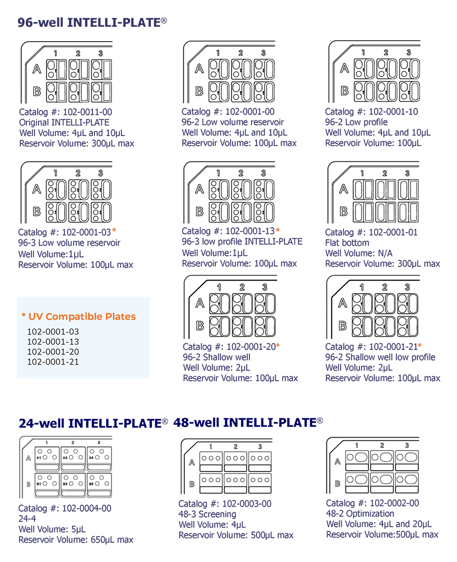 ARI has developed the ideal protein crystallization plate: the INTELLI-PLATE®. All versions of the INTELLI-PLATE® have the SBS microplate footprint and standard well spacing and are ideal for manual or automated processing. The complete INTELLI-PLATE product line, both full height and low profile, is available with barcode labels printed to your specifications. Bar codes are printed and applied in our production facility, so your orders will be shipped promptly.