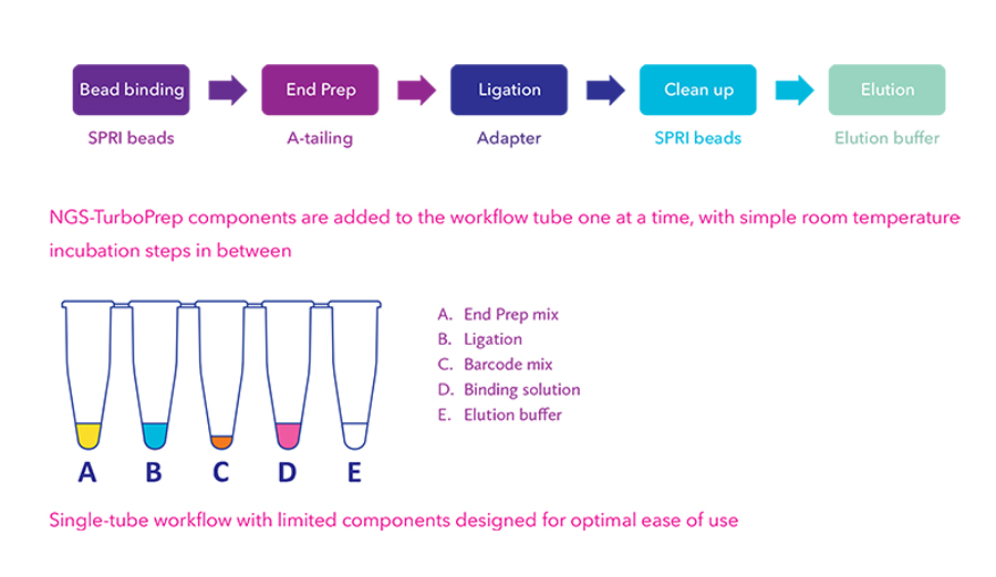 NGS-TurboPrep allows for library preparation in just 30 minutes. The procedure has no fragmentation, and therefore results in full-length intact amplicons. With the added convenience of room temperature incubations and the ability to pause the process at any time, NGS-TurboPrep is the smart choice for workflow simplicity.